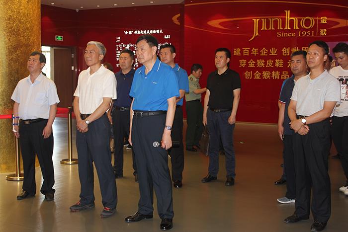 廖廳長一行走進膠東(威海)黨性教育基地金猴集團展陳館,詳細了解了公司生產經營、轉型升級、軍民融合及雙擁工作情況,對公司的技術研發、品牌建設、軍民融合工作及金猴皮鞋、皮具的優異品質給予了充分肯定和高度贊揚。