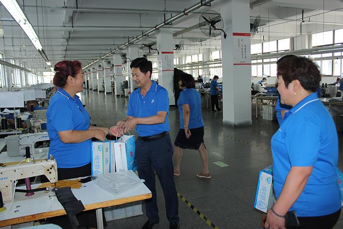 7月12日,集團公司工會主席鄒曉伍帶領工作人員,頂著炎炎烈日,冒著酷暑高溫,把市總工會的慰問帶進皮具公司機針車間,為正在趕制解放軍攜行具、前運袋等軍品訂單的一線職工送去洗化套裝、茶葉、礦泉水等防暑降溫用品,以表達工會組織對廣大職工的貼心關懷。