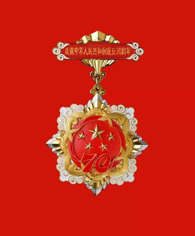 紀念章使用銅胎鍍金材質,通徑為50毫米,主要元素為五星、“70”飄帶、團錦結、如意祥云和光芒,主色調為紅色和金色。核心部分為五星,代表國家榮譽?!?0”飄帶象征中華人民共和國70年奮斗歷程。團錦結環繞在五星和“70”飄帶周圍,寓意全國各族人民大團結,構建人類命運共同體的愿景。章體外環以如意祥云、光芒構成,象征人民對美好生活的向往,同時表達隆重慶祝中華人民共和國生日,禮贊國家富強、民族振興、人民幸福的輝煌成就,以及在70年輝煌奮斗成就的基礎上不忘初心、繼續前進的堅定決心。